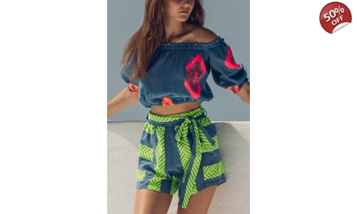 - Off-shoulder crop top from Nema Resortwear to match our shorts Wren.