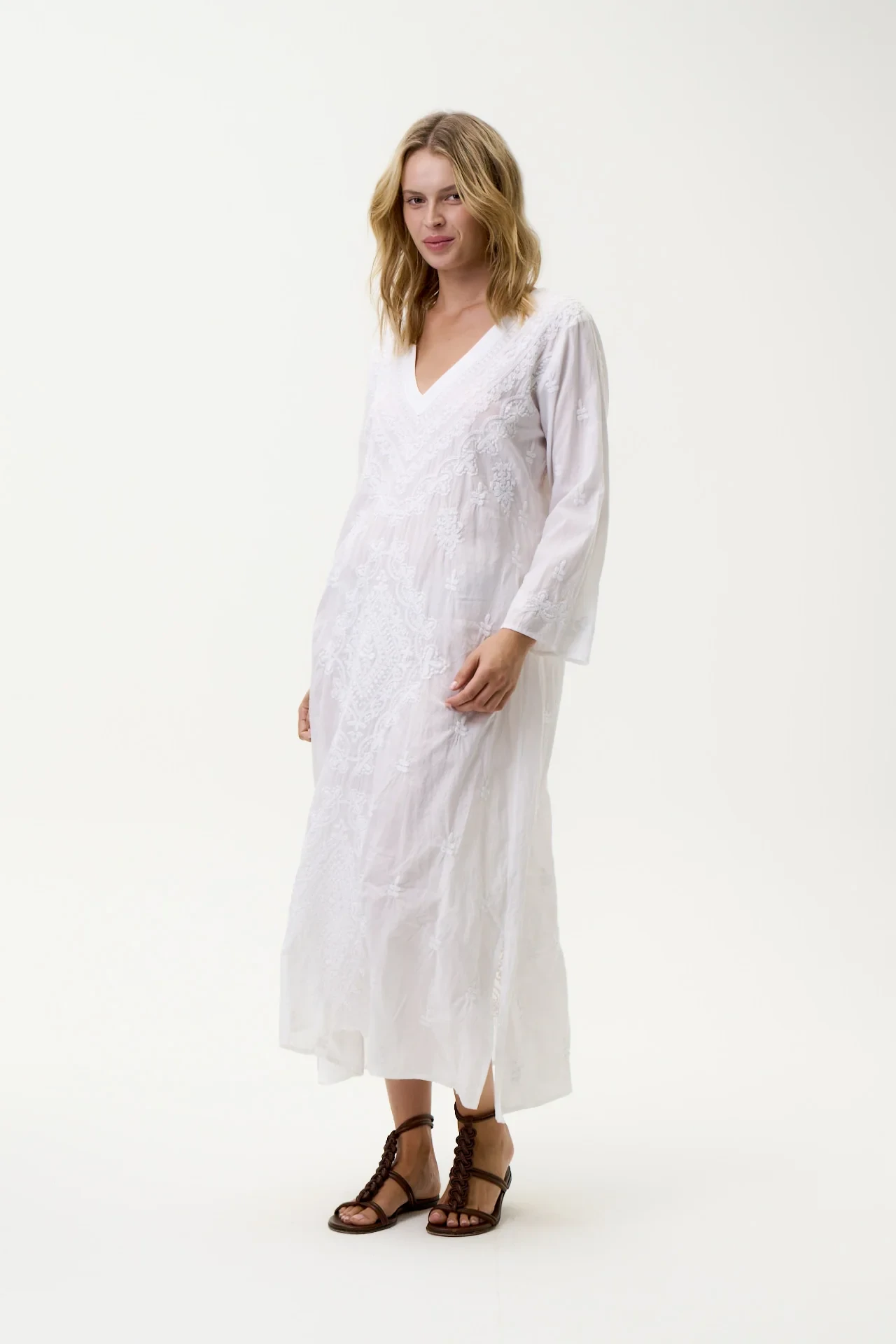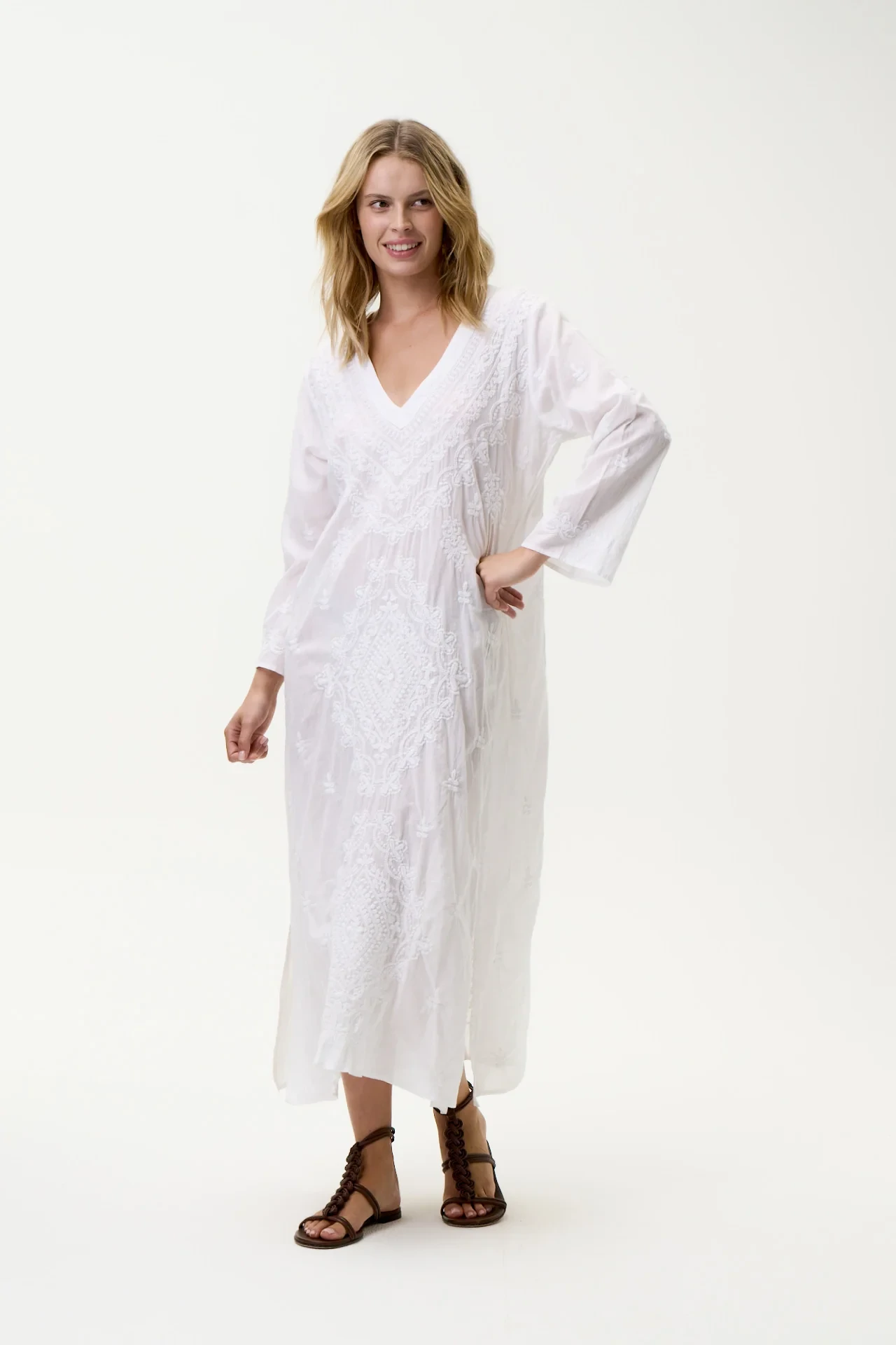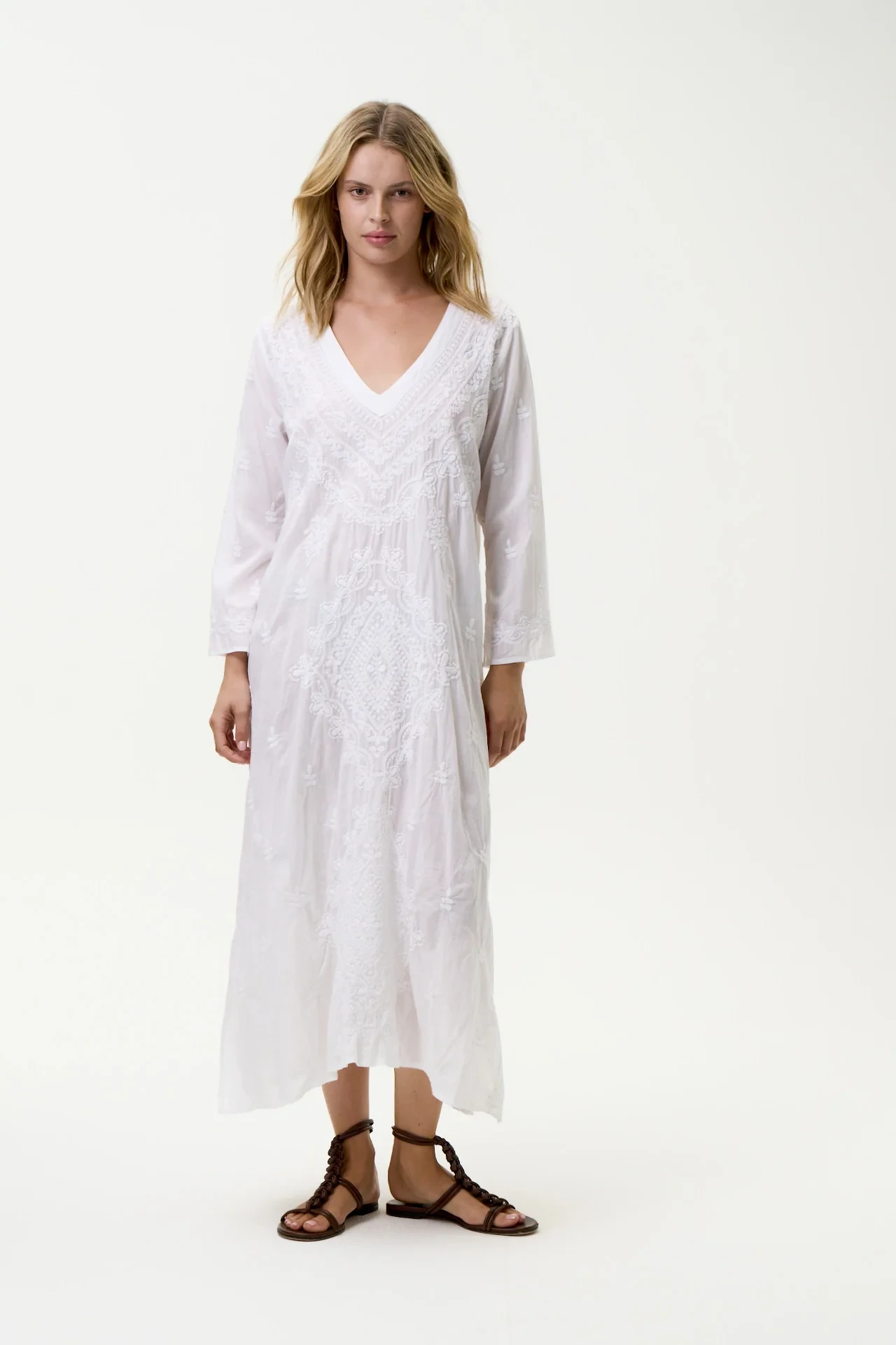 Pair this hand embroidered kaftan with your favorite sandals and a wide-brimmed hat for a chic beach look, or dress it up with statement jewelry for a night out. No matter the occasion, the Long Goa-Embroidery-Cotton-White/White kaftan is sure to make a lasting impression. Embrace the spirit of summer with this versatile and stylish piece that embodies both comfort and elegance.