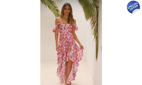 Featuring a beautiful floral print, the Blooming Dress is adorned with vibrant pink hues that will brighten up any occasion. The maxi skirt with leg slit adds a touch of allure, allowing you to show off your legs while maintaining a graceful silhouette. This design not only enhances your figure but also provides comfort and ease of movement, making it perfect for dancing the night away.