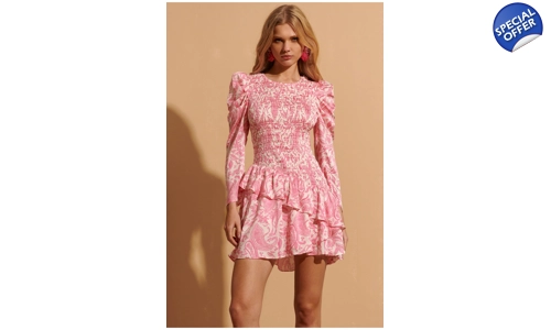 Made from 100% poly with a stretch top half, this dress offers both quality and flexibility. The long sleeves and wide shoulders add a touch of elegance, while the pink on white color scheme exudes fresh summer vibes.