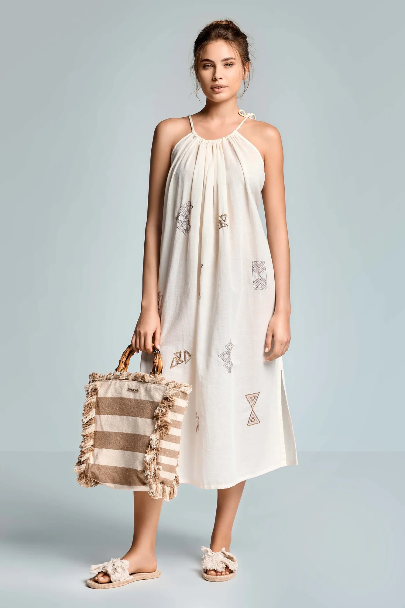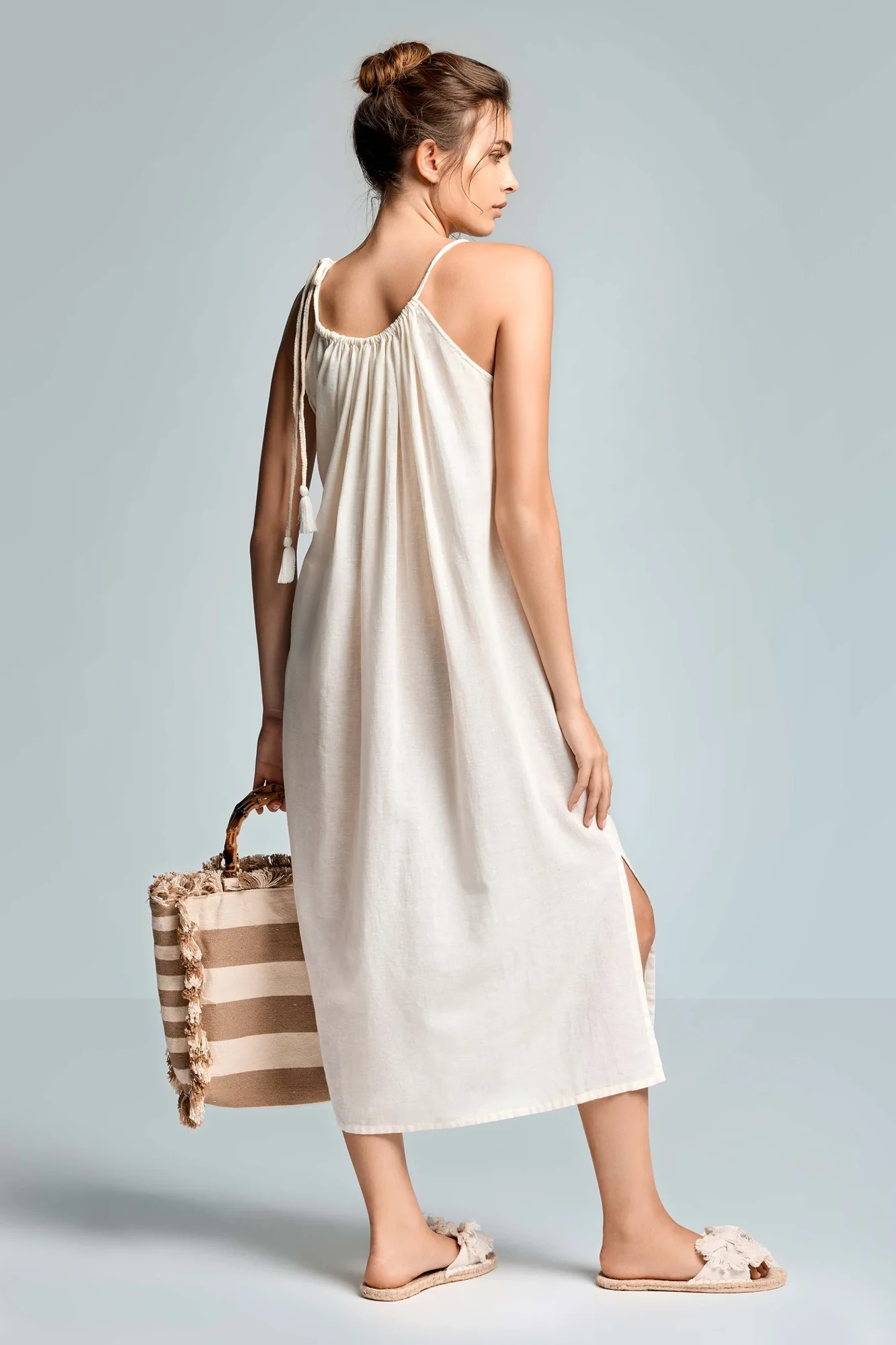 The dress features a flattering midi length that gracefully flows with your every move, making it an ideal choice for both day and night events. The delicate straps add a touch of femininity, while the ivory color keeps it fresh and versatile. Pair it with your favorite sandals for a laid-back beach look, or dress it up with heels for a night out with friends.