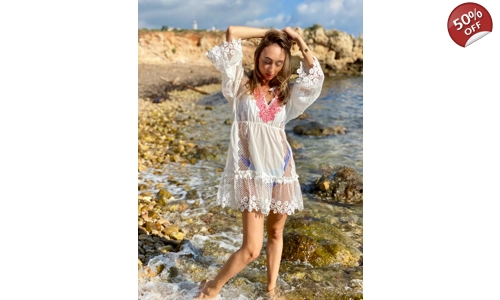 Whether you're lounging by the pool or heading out for an evening soirée, this versatile dress has got you covered. Wear it over your favorite swimwear for a relaxed and chic beach look, or layer it with a slip for a fabulous evening ensemble. The delicate lace panels add a touch of elegance, while the ruffle collar brings a playful and feminine vibe to the dress.