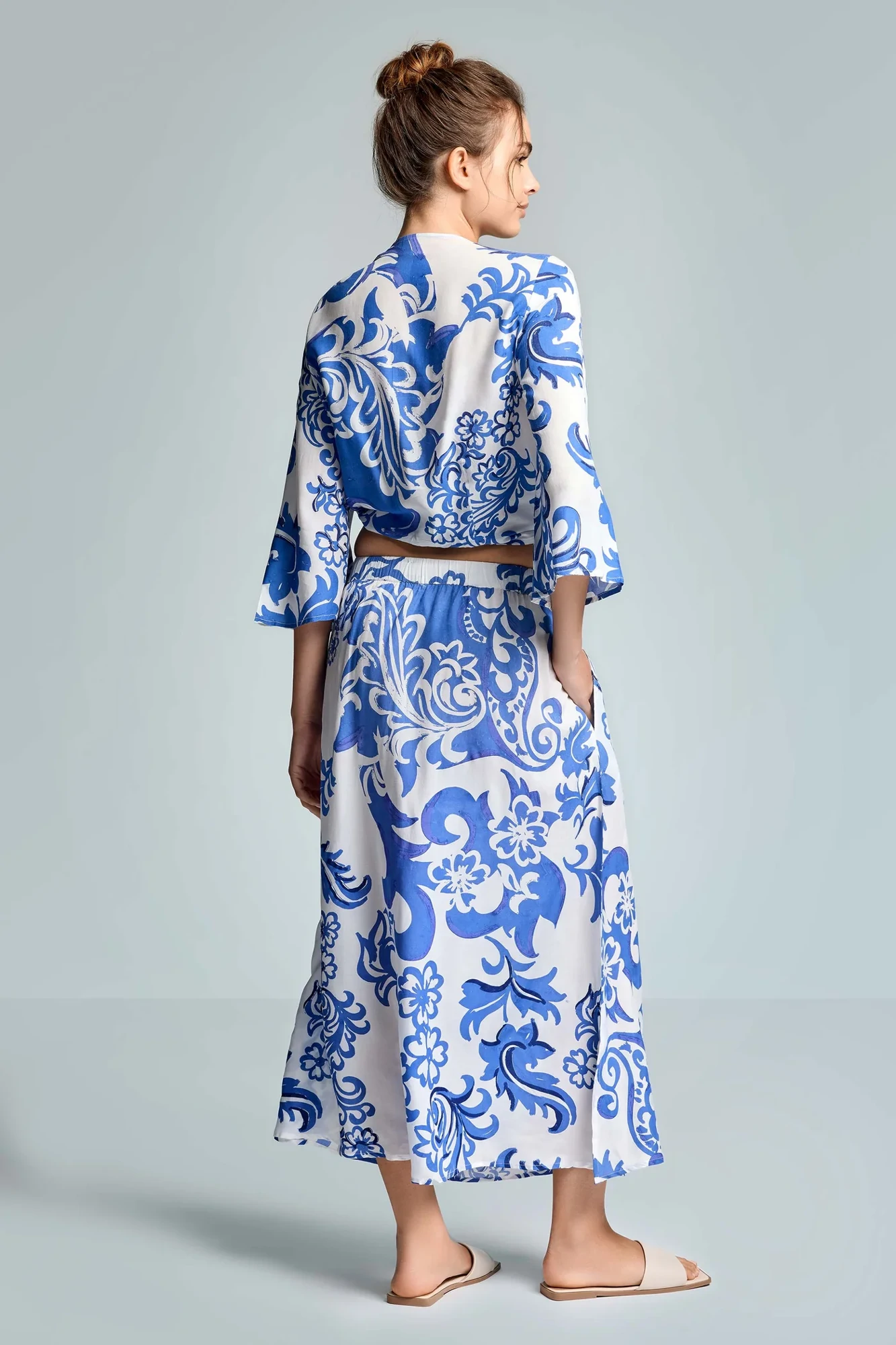 The beautiful white and blue color palette evokes a sense of tranquility, reminiscent of clear skies and ocean waves. Whether you're strolling along the beach or enjoying a summer picnic, this skirt will have you feeling fabulous. The flowing silhouette flatters all body types, making it a versatile choice for any occasion. Pair it with a simple tank top or a stylish crop top, and you're ready to turn heads!